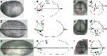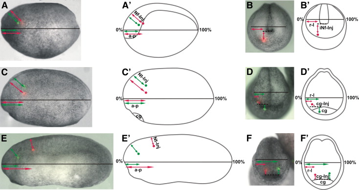 Fig. 2. Standardization of measurements for dye injections at neural plate stages (stage 13/14; A, Aâ², B, Bâ²), at the end of neurulation (stage 19/20; C, Câ², D, Dâ²), and at early tail bud stages (stage 23/24; E, Eâ², F, Fâ²). Lateral views in A, Aâ², C, Câ², E, Eâ² and frontal views in B, Bâ², D, Dâ², F, Fâ². At the neural plate stage, outlines of neural folds are indicated (Aâ², Bâ²). At neural fold and tailbud stages, double outlines are drawn for frontal views (Dâ², Fâ²) to indicate that embryos are narrower rostral (inner outline) than further caudal (outer outline). Immediately after labeling with DiI (red) or DiO (green), embryos were photographed in a precisely oriented lateral (A, C, E) or frontal position (B, D, F). The position of labeled cells (green or red dots in Aâ²âFâ²) along the anteroposterior axis (aâp) and their perpendicular distance from the dorsal edge of the neural folds (Nf-Inj.; Aâ²) or from the dorsal edge of the neural tube (Nt-Inj.; Câ², Eâ²) were measured in lateral views. The position of the anteriormost labeled cells was determined in frontal views by measuring their position along the leftâright axis (râl) and from the inner neural folds (iNF-Inj.; stage 13/14; Bâ²) or from the border of the cement gland (cg-Inj.; stages 19/20 and 23/24; Dâ², Fâ²). All distances were expressed as a percentage of the total length (lateral views) or width (frontal views) of the embryo. Red and green arrows in Aâ²âFâ² illustrate the measured distances. Abbreviation: cg: cement gland.