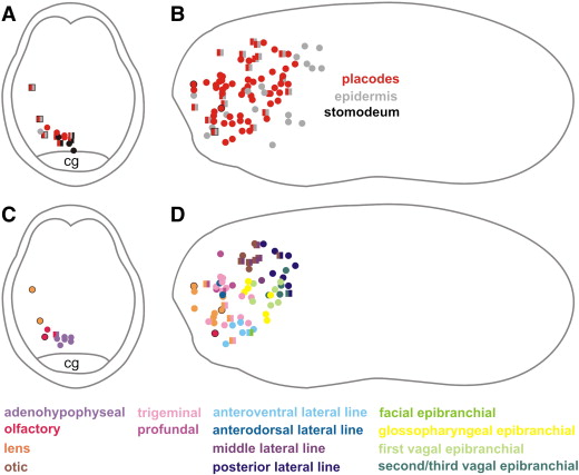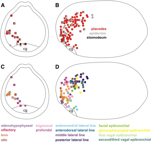 ig. 7. Fate map of Xenopus dorsal cranial non-neural ectoderm at the end of neurulation (stage 19/20). Each symbol represents one dye injection, which contributes to precursors of a single placode or epidermis (circle) or to multiple placodes and/or epidermis (square). Black outlined circles and squares represent injections shown in frontal as well as in lateral views. Frontal views are shown in A and C, lateral views in B and D. A, B: Positions of placodal precursors (red symbols) within the non-neural ectoderm in relation to epidermal (light gray symbols) or stomodeal precursors (black symbols). C, D: Positions of precursors for different types of placodes (color coded as indicated). Overlap and co-labeling between anterior placodes has decreased but is still extensive for posterior placodes. Abbreviation: cg: cement gland. For detailed explanation see text.