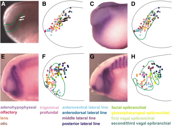 Fig. 9. Comparison of Six1 expression in Xenopus with placodal fate maps (lateral views). A, B: Embryo labeled with DiI at the neural plate stage, which was subsequently analyzed by in situ hybridization for Six1. DiI injections (white arrows in A, black circles and arrows in B) are localized within the expression domain of Six1 (outlined by green line) and map well within the pre-placodal ectoderm in the fate map of neural plate stage embryos. CâH: The expression domains of Six1 (C, E, G and green encircled areas in D, F and H) at neural plate stages (C, D), at the end of neurulation (E, F) and in early tail bud stage embryos (G, H) were measured and compared to our fate maps. Six1 expression corresponds overall well to the distribution of placodal precursors in fate maps. However, at early stages, Six1 expression excludes most injections which contribute to the posterior lateral line placode and second/third vagal epibranchial placodes (D, F). These are localized within the expression domain of Six1 only from early tail bud stage on, indicating delayed upregulation of Six1 in these precursors (H). Conversely, Six1 is downregulated in the future lens placode from late neural fold stage on (EâH). Abbreviation: cg: cement gland. For detailed explanation of fate maps, see Figs. 6â8.