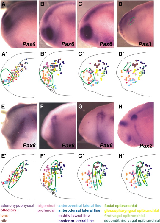 Fig. 10. Comparison of Pax gene expression in Xenopus with placodal fate maps (lateral views). The expression pattern of Pax genes as revealed by in situ hybridization (AâH) were measured at neural plate stages (shown for Pax6 and Pax8: A, E), at the end of neurulation (shown for Pax6 and Pax8: B, F) and in early tail bud stage embryos (shown for Pax6, Pax3, Pax8 and Pax2, C, D, G, H) and compared to fate maps (green encircled areas in Aâ²âHâ²). AâC and Aâ²âCâ²: Pax6 expression encompasses precursors for the olfactory, lens, and trigeminal placodes. D and Dâ²: Pax3 expression is restricted to precursors of the profundal placode (placodal expression domain encircled by hatched green line in D). EâG and Eâ²âGâ²: Pax8 expression is found in precursors of otic, lateral line and epibranchial placodes, but excludes precursors of the vagal epibranchial and posterior lateral line placode. H and Hâ²: Pax2 expression in early tailbud stage embryos is distributed similar to Pax8. Abbreviation: cg: cement gland. For detailed explanation of fate maps, see Figs. 6â8.