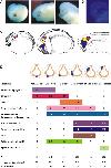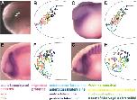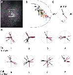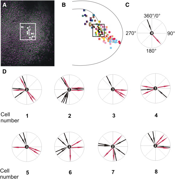 Fig. 12. Analysis of cell neighborhood changes over time. A: Magnified view of rostral non-neural ectoderm of the neural plate stage embryo depicted in Figs. 11AâB (lateral view, anterior is to the right) showing MEM-GFP labeled membranes (green) and H2B-RFP labeled nuclei (red; here shown in magenta false-color). For eight target cells in the deep ectodermal layer (white dots), positions of all neighboring cells including all cells that leave and cease to be neighbors and all cells which become new neighbors were tracked over a time period of 600 min. B: Positions of these target cells (black dots) in relation to the neural plate stage fate map. C: Directions of cells moving away from or towards a target cell (black circle) were depicted as arrows pointing towards or away from it. Red arrows indicate the directions (0°â360°) into which old neighbors were lost, while black arrows indicate directions (0°â360°) from where new neighbors were gained. Directions were categorized into 45° sectors. The number R within the black circle indicates the number of neighbors that do not change over the recorded time period. D: Cell neighborhood changes for each of the eight cells depicted in A. In total, the neighborhood changes of 30 cells were analyzed.