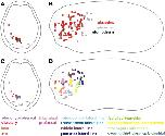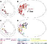 Fig. 8. Fate map of Xenopus dorsal cranial non-neural ectoderm at early tail bud stage (stage 23/24). Each symbol represents one dye injection, which contributes to precursors of a single placode or epidermis (circle) or to multiple placodes and/or epidermis (square). Black outlined circles and squares represent injections shown in frontal as well as in lateral views. Frontal views are shown in A and C, lateral views in B and D. A, B: Positions of placodal precursors (red symbols) within the non-neural ectoderm in relation to epidermal (light gray symbols) or stomodeal precursors (black symbols). C, D: Positions of precursors for different types of placodes (color coded as indicated). Placodes are now more separated from each other. Abbreviations: cg: cement gland. For detailed explanation see text.