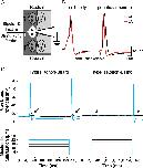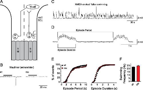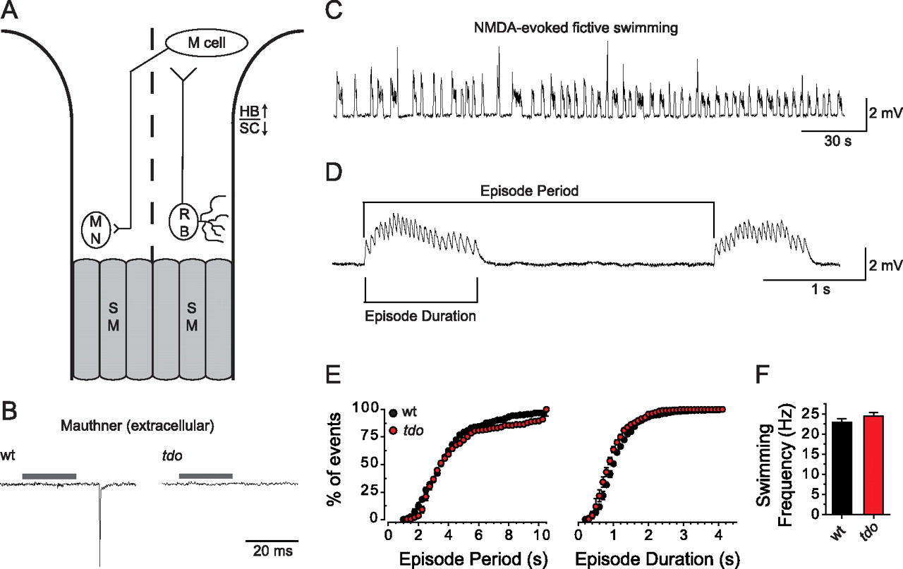 Tactile stimuli in touchdown mutants fails to activate second-order neurons and the locomotor network that generates swimming in zebrafish. A, Schematic of a minimal touch-evoked circuit in zebrafish. MN, Motor neuron; SM, skeletal muscle; HB, hindbrain; SC, spinal cord. Dashed line designates the dorsal midline; anterior is up. B, Extracellular recordings from wild-type and touchdown mutant larva using electrodes positioned to detect Mauthner neuron spikes showing that tactile stimulation activates M cells in wild-type but not touchdown larvae at 55 hpf. Gray bars indicate time of the stimulus to the puffer pipette. C, Several minutes of NMDA-evoked fictive swimming episodes recorded from axial skeletal muscle in a wild-type larva (55 hpf) in the presence of 3 μM curare, a concentration sufficient to attenuate membrane depolarization below the level necessary to induce excitationâcontraction coupling. D, A faster sweep of NMDA-evoked fictive swimming detailing episode period, episode duration, and swimming frequency (frequency of endplate potentials within an episode). The first episode lasted 1.06 s and had 22 peaks, for a swim frequency of 20.75 Hz. E, Cumulative plots of episode periods and durations in wild-type and touchdown mutant larvae showing that episode period and durations are not affected by the mutation. F, Histogram showing that the frequency of NMDA-evoked fictive swimming is comparable between wild-type and touchdown mutant larvae (n = 5 for each).