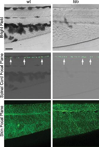 The gross morphology of RBs appears normal in touchdown mutants. Top, A lateral bright field view of the trunk and tail regions from ssx-mini-ICP:eGFP transgenic wild-type and touchdown mutant larvae at 55 hpf. Rostral is to the left and dorsal is up. Scale bar, 50 μm. Middle, Confocal microscope view of the same regions displaying RB cell bodies (detected by using anti-GFP and a fluorescent secondary antibody) superimposed over the bright field image. The microscope was focused at the level of the RB cell bodies. Bottom, The same larvae viewed in a different focal plane that highlights RB peripheral neurites within the skin.