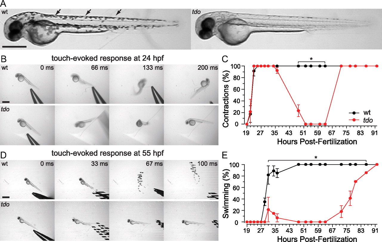 touchdown mutants are hypopigmented and display a transient loss of touch-evoked behaviors. A, Lateral view of wild-type (left) and touchdown mutant (right) larvae at 55 hpf. Arrows point to a few of the visible melanophores, which contribute to pigmentation in wild-type zebrafish but are missing in touchdown larvae. Scale bar, 200 μm. B, Frames of videos showing touch-evoked escape contractions at 26 hpf of wild-type (top) and touchdown (bottom) embryos. 0 ms is the video frame preceding contact of the embryo by the stimulating probe. Scale bar, 500 μm. C, The percentage of wild-type (black) and touchdown mutants (red) displaying touch-evoked contractions between 19 and 92 hpf (n = 24 from three clutches) showing that touchdown mutants do not respond between 52 and 63 hpf. Values represent the average ± SEM. *p < 0.05, t test. D, Video frames showing touch-evoked swimming at 55 hpf of wild-type (top) but not of touchdown (bottom) larvae. Of note, swimming larvae sometimes appear in two places as the behavior was faster than the sampling rate of the camera. Scale bar, 500 μm. E, The percentage of wild-type (black) and touchdown mutants (red) displaying touch-evoked swimming between 19 and 92 hpf (n = 24 from three clutches).
