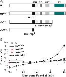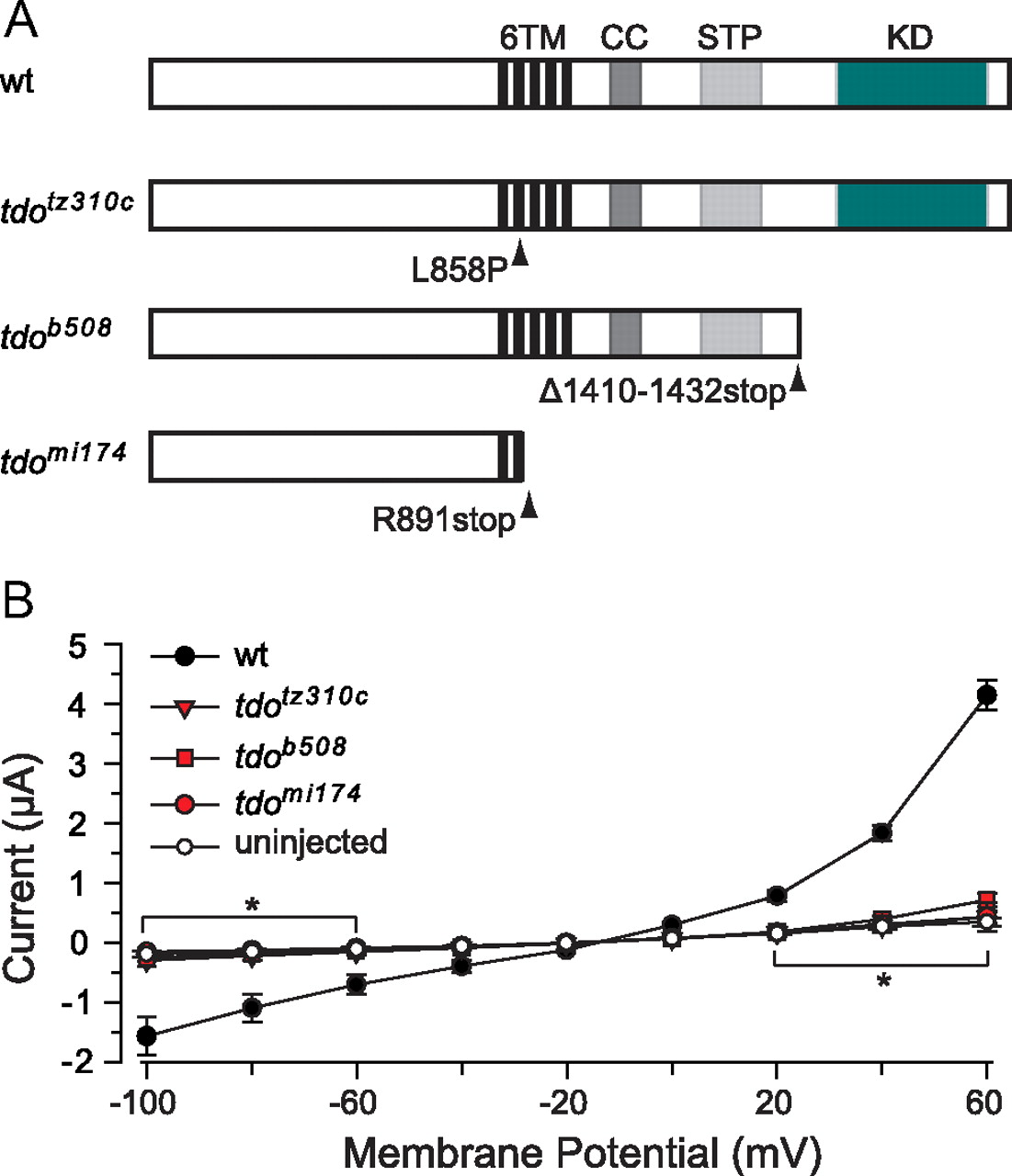 touchdown alleles tdotz310c, tdob508, and tdomi174 harbor mutations that abolish channel activity. A, A graphic representation of TRPM7 indicating the location of mutations in the three alleles of touchdown. CC, Coiled-coil domain; STP, serine-threonine-proline rich domain; KD, kinase domain. B, Average current responses of oocytes expressing wild-type TRPM7 or touchdown alleles to voltage ramps between −100 and +60 mV (n = 10 oocytes for each allele) showing that all three alleles lack channel activity (i.e., the currents in response to ramps were not significantly different from those of uninjected oocytes). Values represent the average ± SEM. *p < 0.05, t test.