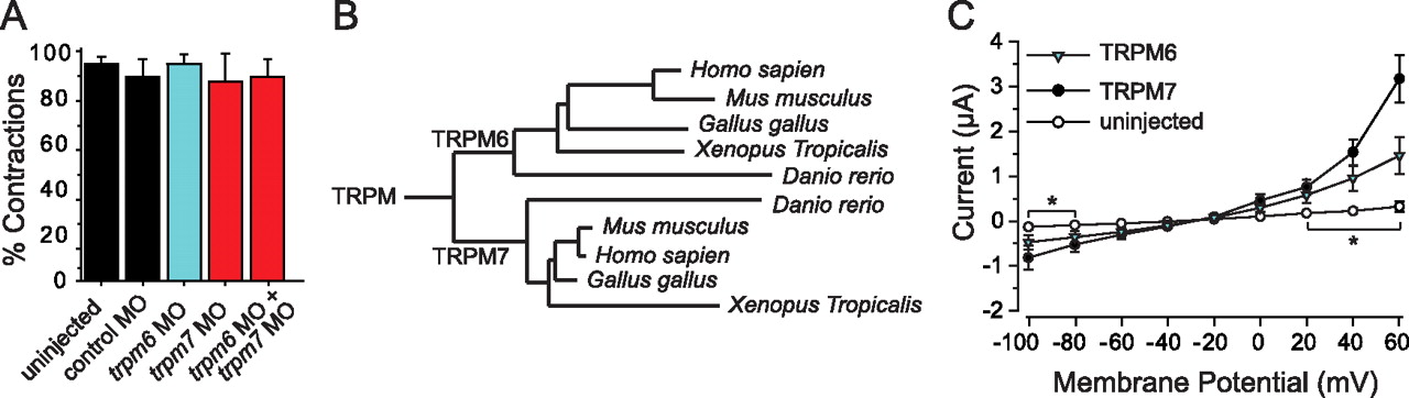 The touchdown phenotype results from the loss of TRPM7 during larval development. A, Histogram showing the percentage of embryos injected with the indicated antisense MO that responded to tactile stimuli with escape contractions at 24 hpf (n > 60 from three clutches). Injection of trpm7, trpm6, and trpm7+ trpm6 antisense MOs did not affect touch-evoked contractions. B, A phylogenetic tree showing the assignment of the identified protein as the zebrafish ortholog of TRPM6. C, Average current responses of oocytes expressing wild-type TRPM7 or TRPM6 to voltage ramps between −100 and +60 mV (n = 10 for each allele), showing that TRPM6 exhibits a outwardly rectifying current similar to TRPM7. *, Current values of TRPM6 and TRPM7 that were significantly different from uninjected controls (p < 0.05). The amplitude of TRMP6 responses at +60 mV was significantly smaller than TRPM7 responses.