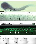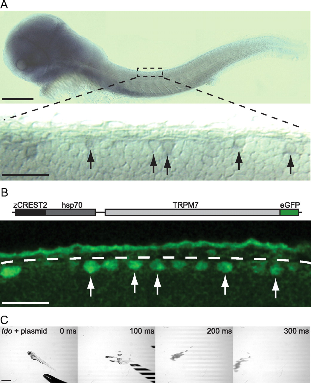 Selective restoration of TRPM7 expression in sensory neurons is sufficient to restore touch-evoked responses. A, Top, Lateral view of a 55 hpf larva labeled with a riboprobe against trpm7 showing that trpm7 is expressed widely in the larva. Boxed area indicates enlarged area shown below. Scale bar 200 μm. Bottom, Enlarged area highlighting a few RB sensory neurons expressing trpm7, with some RBs indicated with arrows. Scale bar, 50 μm. B, Top, Rescue plasmid comprised of the sensory neuron enhancer/promoter construct zCREST2-hsp70:TRPM7-eGFP. Bottom, Lateral view of the dorsal spinal cord following injection of the sensory enhancer/promoter construct labeled with anti-GFP showing that TRPM7-eGFP is expressed by many RBs, some of which are marked by arrows. Dashed line denotes the dorsal boundary of the spinal cord. Green labeling above dashed line was also observed in uninjected embryos, indicating that is background labeling of the skin by anti-GFP. Scale bar, 50 μm. C, Expression of TRPM7 selectively in RBs rescues touch-responsiveness in touchdown mutant larvae. Video frames of touch-evoked swimming from a 55 hpf hypopigmented touchdown mutant expressing the rescue plasmid. 0 ms is the video frame preceding contact of the embryo by the stimulating probe. Scale bar, 500 μm.