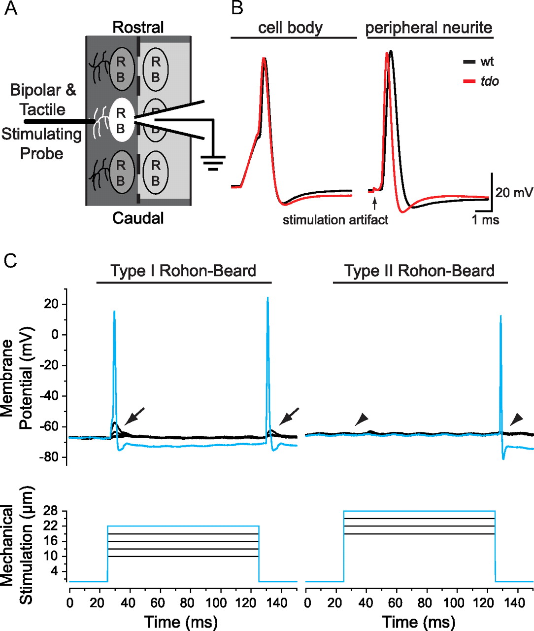 Cutaneous mechanoreceptors respond to tactile stimuli in touchdown mutants. A, A representation of the preparation used to record electrical and tactile-evoked responses in RBs. The dashed line designates the dorsal midline. The light gray area indicates the region in which the skin and muscle were removed to allow access to a contralateral RB cell body with an intact peripheral neurite (white). The stimulating probe was placed on the skin directly overlying the peripheral neurite. B, RB responses to depolarizing current injections (2 ms) to the cell body, and extracellular electrical stimulation (1 ms) of the peripheral neurite showing that the RBs are excitable in wild-type and touchdown mutant larvae. C, Touchdown mutants possess both type I and type II RBs (see text). In type I RBs, a subthreshold tactile stimulus (black) applied to the peripheral neurite resulted in an observable generator potential (arrows) at the onset and offset of the stimulus. In these RBs, increasing the amplitude of stimuli eventually triggered action potentials (cyan) at the onset and the offset of the stimulus. In type II RBs, activation by tactile stimuli produced action potentials (cyan) without visible generator potentials (arrowheads) in response to subthreshold stimuli (black).