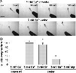 Elevation of extracellular divalent cations rescues touch responsiveness in touchdown mutants. A, Video images of 55 hpf touchdown mutant larvae in 5 mM Ca2+ showing no response to touch when the skin was not removed (top), and exhibiting swimming in response to touch when the skin over several rostral somites (∼5–10) had been peeled, allowing rapid diffusion of elevated divalent cations into the CNS (bottom). 0 ms is the video frame preceding contact of the embryo by the stimulating probe. Scale bar, 1 mm. B, Average responsiveness of unpeeled touchdown mutant larvae in the presence of 5 mM Ca2+ to tactile stimuli compared with peeled mutant larvae in the presence of 5 mM Ca2+, Ba2+, Sr2+, or Mg2+ (n = 15 from three clutches). Ca2+, Sr2+, and, to a lesser extent, Ba2+, but not Mg2+, increased responsiveness to touch of peeled touchdown mutants. *p < 0.05, t test.