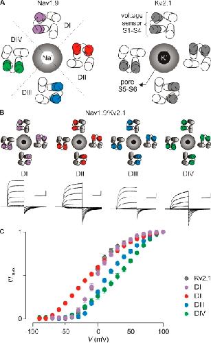 The voltage-activated sodium (Nav) channel Nav1.9 is expressed in dorsal root ganglion (DRG) neurons where it is believed to play an important role in nociception. Progress in revealing the functional properties and pharmacological sensitivities of this non-canonical Nav channel has been slow because attempts to express this channel in a heterologous expression system have been unsuccessful. Here, we use a protein engineering approach to dissect the contributions of the four Nav1.9 voltage sensors to channel function and pharmacology. We define individual S3b-S4 paddle motifs within each voltage sensor, and show that they can sense changes in membrane voltage and drive voltage sensor activation when transplanted into voltage-activated potassium channels. We also find that the paddle motifs in Nav1.9 are targeted by animal toxins, and that these toxins alter Nav1.9-mediated currents in DRG neurons. Our results demonstrate that slowly activating and inactivating Nav1.9 channels have functional and pharmacological properties in common with canonical Nav channels, but also show distinctive pharmacological sensitivities that can potentially be exploited for developing novel treatments for pain.