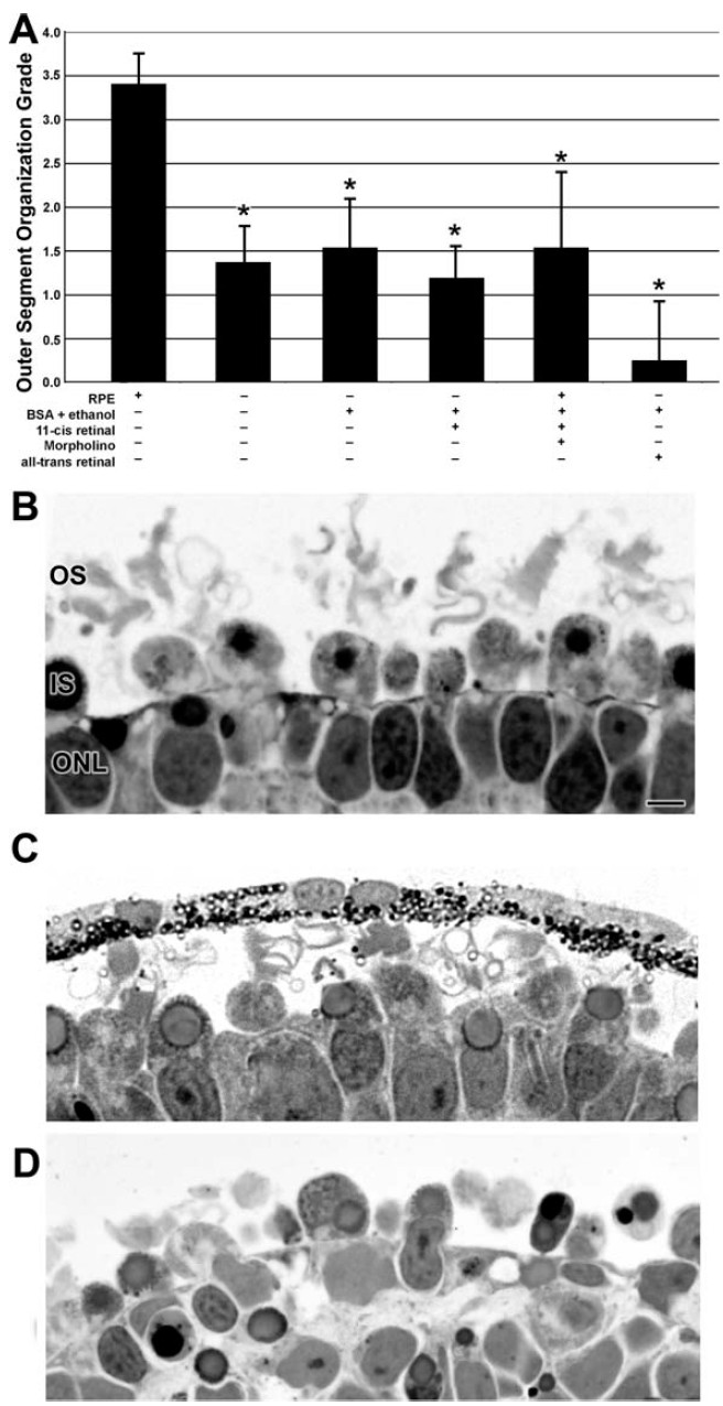 In a previous study, we used differential proteomics to identify retinal proteins whose steady-state levels were altered in an experimental system in which photoreceptor outer segments were improperly folded. We determined that the steady-state level of cellular retinol binding protein 1 (CRBP1) was downregulated in eyes lacking organized outer segments. The purpose of this study was to determine if CRBP1 is a plausible candidate for regulating outer segment assembly. We used Morpholinos to directly test the hypothesis that a decreased level of CRBP1 protein was associated with the misfolding of outer segments. Results from these studies indicate that downregulation of CRBP1 protein resulted in aberrant assembly of outer segments. Because CRBP1 plays a dual role in the retina-retinal recycling and generation of retinoic acid-we evaluated both possibilities. Our data demonstrate that outer segment folding was not modified by 11-cis retinal supplementation, suggesting that CRBP1 influences outer segment assembly through a mechanism unrelated to rhodopsin regeneration. In contrast, retinoic acid is required for the proper organization of nascent outer segment membranes. The localization of CRBP1 within Muller cells and the RPE and its demonstrated role in modulating the proper folding of nascent outer segment membranes through retinoic acid further elucidates the role of these cells in directly influencing photoreceptor physiology.
