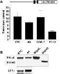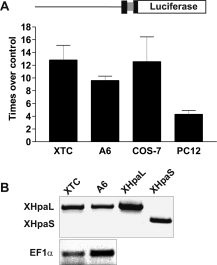 Figure 5. Cloning and identification of a functional promoter upstream of the XHpa gene. A: A schematic representation of the 2.1 kb of the 5′ region of xHpa gene, containing exon 1 and 2 (black rectangles) and intron 1 (gray rectangle) cloned into the luciferase reporter construct. Two Xenopus cell lines (A6 and XTC), as well as a rat (PC12) and monkey (COS-7) cell line, were transiently co-transfected with the luciferase xHpa and renilla constructs. Cells were lysed 306 hr after transfection, and luciferase and renilla activities were determined from triplicate wells. The ratio of luciferase / renilla activity was determined for each well and is expressed as fold induction relative to the empty luciferase reporter construct, pGL3 basic. Results of three independent experiments are shown. Bars reflect means SEM. B: reverse transcriptase-polymerase chain reaction products for xHpaL, xHpaS, and ef1α generated from total cDNA obtained from XTC and A6 cells. Polymerase chain reaction amplification products generated from xHpaL and xHpaS DNA constructs are shown as positive controls.