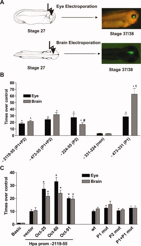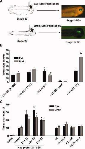 Figure 9. Promoter 1 and promoter 2 have distinct functional activities in different tissues. A: Schematic depicting the two tissue targeting approaches used to analyze the functionality of the different xHpa promoter constructs in Xenopus tadpoles. At stage 27, eye or brain was selectively electroporated with luciferase reporter constructs, together with renilla and GFP expression vectors to confirm the correct targeting. Reporter activity was measured at stage 37/38. A picture of two embryos from a â473: â331 group electroporated into either the eye (top) or the brain (bottom) are shown. B: Constructs containing P1, P2 or both P1 and P1 promoters were electroporated into the brain or the eye as explained in A. C: Heparanase promoter â2119: â55 (wt) driving luciferase expression, or mutated either in the Oct-binding site 4 (P1 mutated) or Oct-binding site 1 (P2 mutated, or both, was co-electroporated with an empty vector or expression vectors for Oct-25, Oct-60, or Oct-91. B,C: Five high-expressing embryos in each group were lysed and analyzed. The ratio of luciferase / renilla activity was determined for each embryo, and is expressed as fold induction relative to embryos electroporated with an empty luciferase reporter construct, pGL3 basic. Results of two independent experiments are shown. Bars reflect means SEM. *P < 0.01 vs. control pGL3 basic construct (in B) and vs. vector (in C); tP < 0.05 vs. construct â224: â55; #P < 0.01 vs. construct â473: â55.