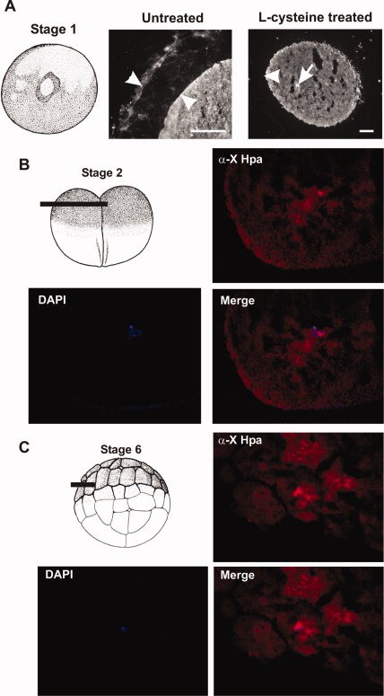 Figure 2. At early embryonic stages heparanase immunoreactivity is present in the jelly coat, the plasma membrane and in proximity to the DNA within the cell. Immunohistochemistry with the antibody against Xenopus heparanase (αXHpa) of cryostat sections from fertilized single cell (A), two-cell stage (B), and stage 6 (C) embryos. A: Fertilized eggs treated with or without L-cysteine to remove the jelly coat. Immunostaining is present in the external layer of the jelly coat and the cell membrane (arrowhead), with an intense intracellular immunoreactive region (arrow). B,C: Immunohistochemistry of transverse cryostat sections of two-cell stage and stage 6 embryos with the αXHpa antibody and the nuclear DNA labeled with DAPI (4â²,6-diamidine-2-phenylidole-dihydrochloride). Panels with a merge of the two labels are also shown. Scale bar = 100 μm.Download figure to PowerPoint