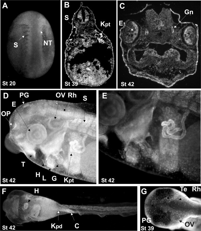 Figure 4. Heparanase expression during neurulation, organogenesis, and in tailbud embryos. Immunohistochemistry of whole embryos (A,DâG) and sections (B,C) at different stages of development using the αXHpa antibody. A: Dorsal view of a stage 20 embryo (anterior up). B,C: Transverse sections of tadpole stage embryos (dorsal up). DâG: Lateral (D,E), ventral (F), and dorsal (G) views of tadpole stage embryos. A higher magnification view of D is shown in E. C, cloaca; E, eye; G, gill; Gn, ganglion; H, heart; Kpd, kidney pronephric duct; Kpt, kidney pronephric tubule; L, liver; OP, olfactory placode; OV, otic vesicle; PG, pineal gland; Rh, rhombencephalon; S, somites; NT, neural tube; Te, tectum.Download figure to PowerPoint