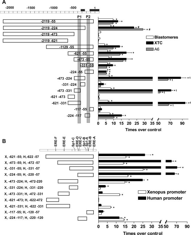 Figure 7. Identification of two functional promoters in the Xenopus Hpa gene. A, Left: Schematic representation of the fragments of the 5â²-flanking regions of the Xenopus Hpa gene fused to the firefly luciferase cDNA and inserted into the pGL3 basic vector. The first two exons (filled box) are indicated, and the numbers are relative to from the ATG codon that translates to the first methionine (+1) localized in exon 2. The promoters, one localized upstream of exon 1 (P1) and the other in the intron (P2), are represented as vertical gray rectangles. A6 and XTC cells were co-transfected with the indicated Xenopus reporter gene constructs and a renilla control plasmid. Cells were lysed 306 hr after transfection, and luciferase and renilla activities were determined from triplicate wells. Xenopus embryos were microinjected into both cells at the two-cell stage with renilla and luciferase constructs, and activity measured from lysed embryos at stage 10. A, Right: Luciferase data were normalized to the renilla activity, and are graphically presented as the ratio relative to the activity of the pGL3 basic construct without promoter. The diagram integrates results of 3 independent experiments. Bars reflect means SEM. B, Left: Schematic representation of Xenopus (X) and human (H) constructs containing the 5â² flanking region of the hpa gene fused to firefly luciferase cDNA. The Sp1 and ERE sites present in the human sequence are shown. B, Right: COS-7 cells were co-transfected with the corresponding Xenopus (open boxes) or human (filled boxes) luciferase and renilla constructs and analyzed as indicated in A. *P < 0.01 vs. control pGL3 basic construct; #P < 0.01 vs. â2199:â55 construct; tP < 0.01 vs. constructs containing P1 and P2, or P2 alone.