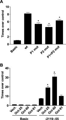 Figure 8. Oct-25 and Oct-60 stimulate heparanase expression. A: Embryos were microinjected in both cells at the two-cell stage with a renilla construct and the wild-type (wt) Hpa promoter â2119: â55 driving the expression of luciferase, or the Hpa promoter construct mutated in the Oct-binding site 4 (located in promoter 1) or Oct-binding site 1 (located in promoter 2), or both sites. The luciferase and renilla activity was measured from lysed embryos at stage 12. Luciferase data were normalized to the renilla activity, and are graphically presented as the ratio relative to the activity of the pGL3 basic construct without promoter. B: Basic pGL3-vector or Hpa promoter â2119: â55 driving luciferase expression were co-injected into both cells of the two-cell stage embryo either with an empty pCS2-vector (vector), or pCS2 expression vectors for Oct-25, Oct-60, or Oct-91. Luciferase data were normalized to the renilla activity, and are graphically presented as the ratio relative to the activity of the pGL3 basic construct without promoter. For both A and B, graphs show integrated results of two independent experiments. Bars reflect means SEM. *P < 0.01 vs. wt promoter â2119: â55.