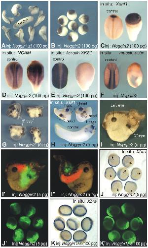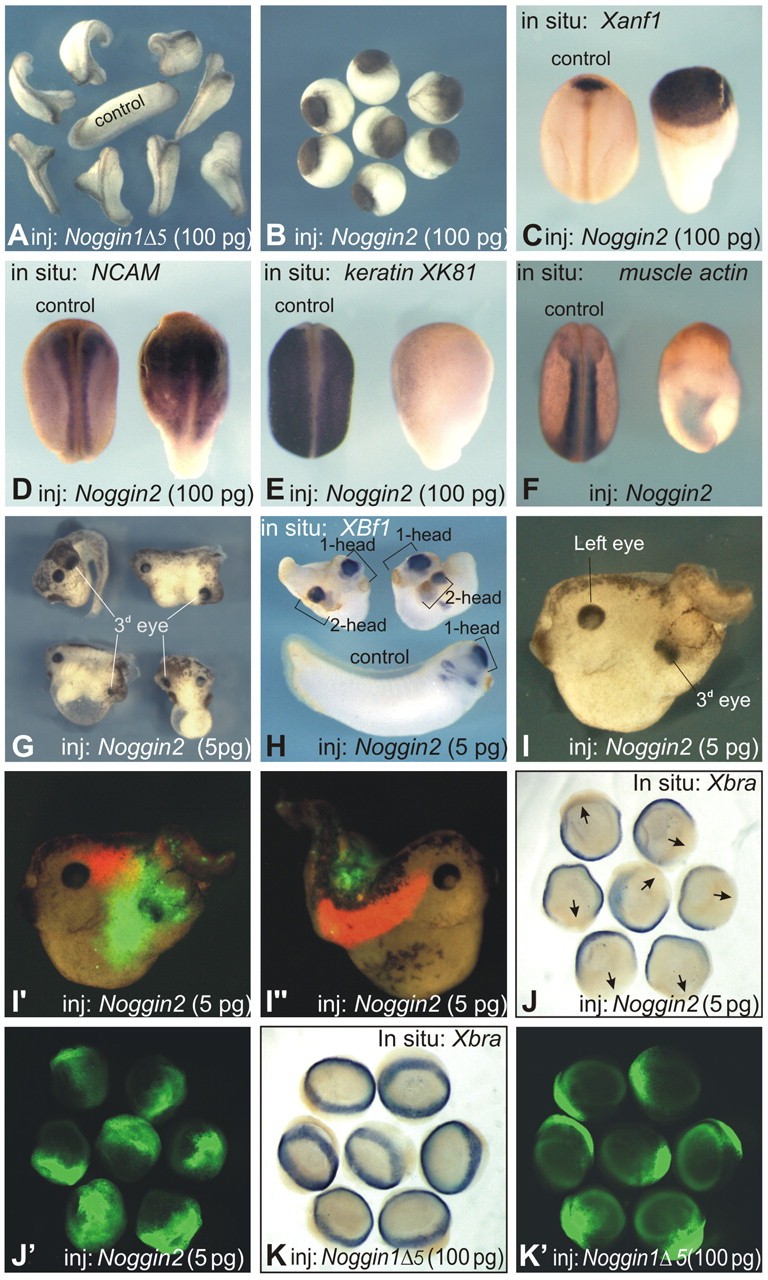 Fig. 1. Wild-type Noggin2 mRNA elicits effects distinct from those induced by wild-type Noggin1 mRNA. (A,B) Ventral injections of Noggin1δ5 mRNA induce secondary axes (A), whereas similar injections of Noggin2 mRNA resulted in mushroom-shaped embryos (B). (C-F) Whole-mount in situ hybridization of the control (left in each photo) and the Noggin2 mRNA-injected (right) embryos demonstrates strong upregulation of the neural (C,D) marker genes, and inhibition of epidermal (E) and muscle (F) marker genes. (G) Ventral injections of Noggin2 mRNA induce formation of secondary heads with cyclopic eyes. (H) The forebrain marker XBF1 is expressed in the secondary heads of embryos injected by Noggin2 mRNA. (I-Iâ²) The embryo of a transgenic line expressing RFP in muscles has reduced muscle differentiation on the left side where a secondary head with cyclopic eye was induced by injection of the mixture of Noggin2 mRNA and FLD tracer. The same embryo under white light (I) and as an overlay of white light, red and green fluorescent images (Iâ², left side; Iâ², right side). (J-Kâ²) Noggin2 (J,Jâ²) but not Noggin1 mRNA (K-Kâ²) inhibits (arrows) XBra expression in blastopore marginal zone. Embryos at stage 10.5 are shown from the vegetal pole.