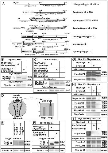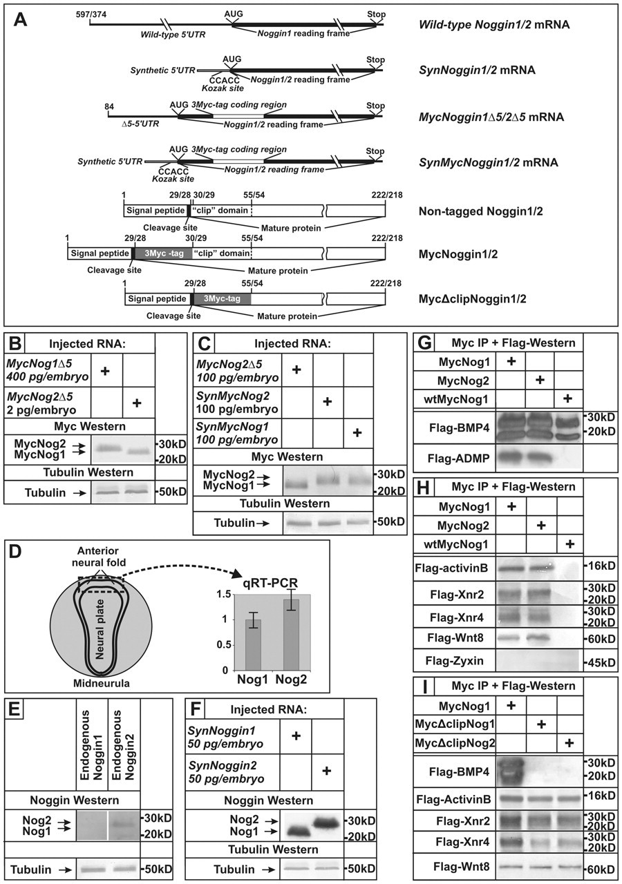Fig. 2. Noggin1 and Noggin2 can bind TGFβ and Wnt ligands. (A) Selected mRNA and proteins used in the present study. (B,C) Comparison of translation capacities of MycNoggin1δ5 and MycNoggin2δ5 mRNA (B) or MycNoggin2δ5, SynMycNoggin1 and SynMycNoggin2 mRNA (C) injected in two-cell embryos at the indicated concentrations. Five embryos of each type were collected at stage 10 in 50 μl of lysis buffer and Noggin proteins were revealed by western blotting with anti-Myc antibody either in 1/5 (B) or in 1/125 (C) aliquots of this volume. Here and below, α-tubulin was detected with anti-tubulin antibodies (DM1A, Sigma, final dilution 1:10,000) as a loading control. (D) qRT-PCR analysis of endogenous Noggin1 and Noggin2 mRNA in the anterior neural fold explants of stage 15 embryos. (E,F) Only endogenous Noggin2 (lane 2), but not Noggin1 (lane 1), was detected in the anterior neural fold explants of stage 15 embryos by antibodies specific to Noggin1 and to Noggin2 (E), despite these antibodies demonstrating similar affinities to exogenous Noggin1 (lane 3) and Noggin2 (lane 4) translated from injected SynNoggin1 and SynNoggin2 mRNA (F). In the last case, a mixture of antibodies to both Noggin proteins was used. (G,H) Both Noggin1 and Noggin2 (Ng1 and Ng2) translated from SynMycNoggin1 and SynMycNoggin2 mRNA co-precipitate with Flag-tagged BMP4, ADMP, Activin, Xnr2, Xnr4 and XWnt8. In case of Noggin1 translated from MycNoggin1δ5mRNA (wtNg1), only precipitation with BMP was detected. No precipitation of Noggin proteins was revealed with Flag-tagged Zyxin (negative control). (I) Deletion of the clip-domain sharply reduce ability of Noggin proteins (δNg1, δNg2) to bind BMP4 but much more poorly influences the binding of Noggin to all non-BMP TGFβ ligands tested and to XWnt8.