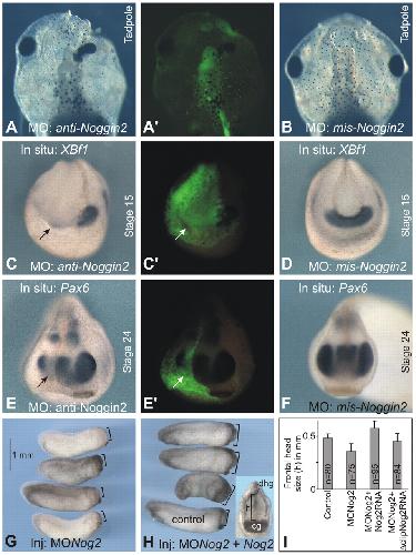 Fig. 6. The effects of inhibition of Noggin2 mRNA translation by MO. (A,Aâ²) Head of the tadpole injected with Noggin2 MO into right side has severe malformations of the righteye, nasal placode and forebrain. Dorsal view, anterior side upwards. (B) Head of the control tadpole. (C,Câ²) The embryo injected with Noggin2 MO into the right side has a reduced expression of the forebrain marker XBF1 (arrows) in the injected cells at midneurula stage. Anterior view, dorsal side upwards. (D) Normal expression pattern of XBF1 in embryo injected with mis-Noggin2 MO. (E,Eâ²) The embryo injected with Noggin2 MO on the right side has a reduced expression of Pax6 (arrows) in the injected cells at the tailbud stage. Anterior view, dorsal side upwards. (F) Normal expression pattern of Pax6 in the embryo injected with the misNoggin2 MO. (G,H) Embryos injected with Noggin2 MO and rescued by co-injection of Noggin2 mRNA. Brackets indicate the distance (h) from the beginning of the dorsal hatching gland (dhg) to the dorsal margin of the cement gland (cg) (see inset photo in H for details). Anterior view, dorsal towards the top. (I) Mean values of âhâ in embryos injected with the indicated MO and mRNAs. Error bars indicate s.d., n, number of embryos. Statistical significance of the difference between mean values was confirmed by independent two-sample Studentâs t-test for unequal sample sizes, unequal variance.