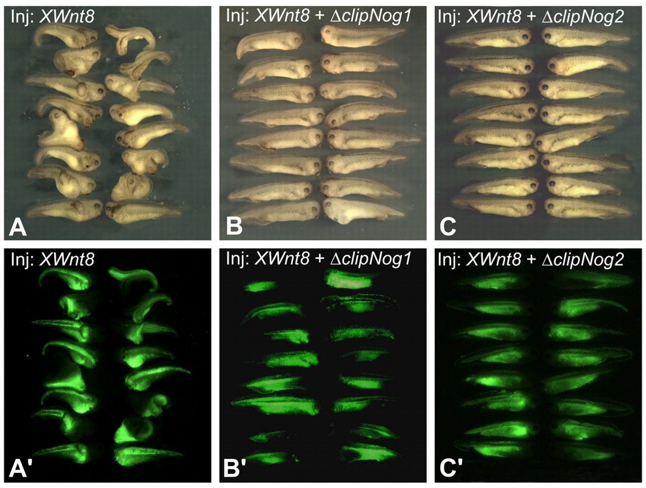 Fig. 5. δclip-domain mutants of Noggin proteins suppress Wnt signaling. (A,Aâ²) Ventral injections of XWnt8 mRNA (3 pg/embryo) elicit development of the head-containing secondary axes due to ectopic induction of the Nieuwkoop center at the blastula stage. (B-Câ²) Co-injection of δclipNoggin1 or δclipNoggin2 mRNA (50 pg/embryo) with XWnt8 resulted in suppression of secondary axes.