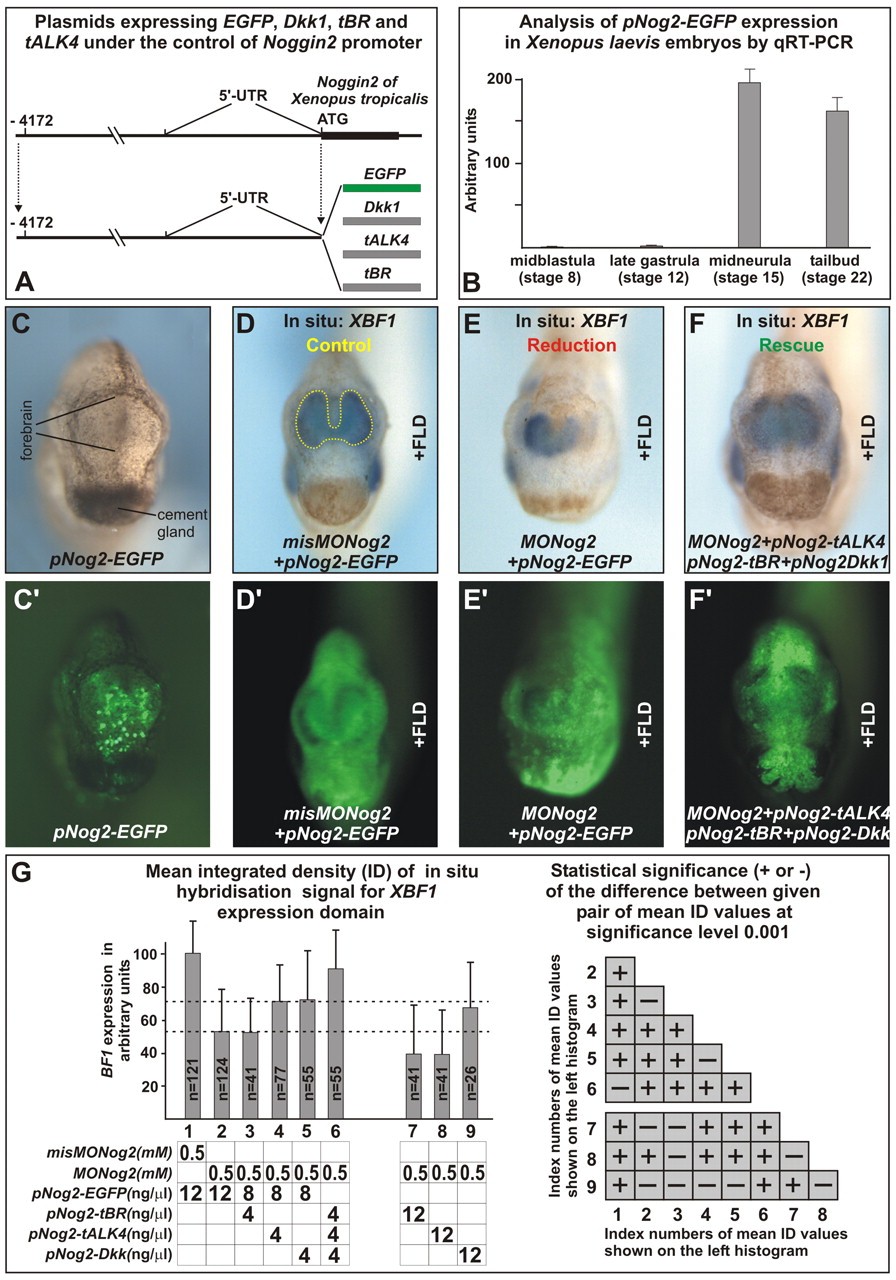 Fig. 7. Rescue of Noggin2 MO morphants by Wnt-, BMP- and Activin/Nodal-specific inhibitors. (A) Plasmids expressing EGFP, Dkk1, tALK4 and tBR under the control of the Xenopus tropicalis Noggin2 promoter. (B) Analysis of pNog2-EGFP expression in Xenopus laevis embryos by qRT-PCR. Each of the dorsal animal blastomeres of eight-cell embryos was injected in the animal corners with 2 nl of pNog2-EGFP (4 ng/μl). Embryos were collected at the indicated stages in batches of 10 in triplicate and qRT-PCR was performed on RNAase-free DNAase pre-treated extracted RNA using primers specific to EGFP and ODC as references. (C,Câ²) A typical stage 26 embryo expressing injected pNog2-EGFP in the forebrain. Anterior view, dorsal side upwards. (D-Fâ²) Expression domains of XBF1 (framed by yellow line on D) in forebrains of embryos injected by the indicated mixtures of MO, plasmids and FLD. The integrated density of XBF1 in situ hybridization signal was measured using the ImageJ program. (G) Statistical analysis of integrated density of in situ hybridization signal within XBF1 expression domain of stage 26 embryos injected with the indicated mixtures of MO and plasmids. The analysis was performed using independent two-sample Studentâs t-test for unequal sample sizes, unequal variance. Broken lines separate values that are most significantly different from one another. Errors bars represent s.d. See supplementary material Table S2 for original data.