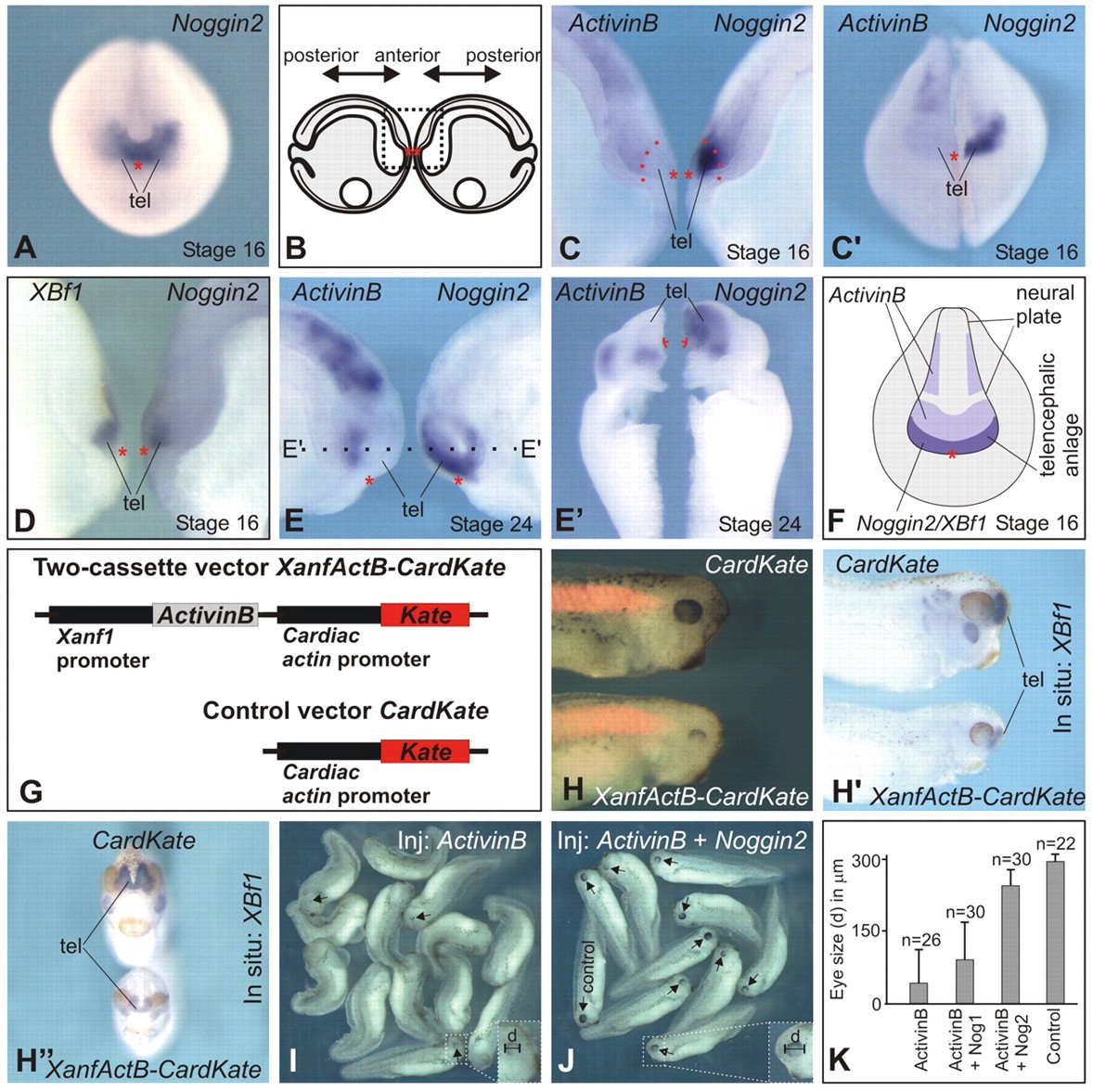 Fig. 8. The inhibition of Activin signaling at the anterior margin of the neural plate is essential for the forebrain development. (A-F) Expression patterns of ActivinB and Noggin2 in the forebrain rudiment revealed by the whole-mount in situ hybridization. (A) At the midneurula stage, Noggin2 is specifically expressed in cells of the anterior neural fold. Anterior view of the whole embryo, dorsal side upwards. Red asterisk marks the median of anterior neural fold. (B) The area of embryonic halves (outlined) shown in C-E. (C) Expression of ActivinB and Noggin2 on halves of the same midneurula embryo. ActivinB is not expressed in the triangular region of the neurectoderm, between the broken red line and asterisk, in which Noggin2 is expressed. (Câ²) The same hemi-section as in C, but combined together to form the whole embryo and shown from the anterior side. (D) Expression of the telencephalic marker XBF1 and Noggin2 on halves of the same midneurula embryo. XBF1 and Noggin2 are expressed in the same cells at the anterior margin of neural plate. (E) Expression of ActivinB and Noggin2 on bilateral halves of the same tailbudembryo. ActivinB is not expressed in the telencephalon rudiment (tel) in which Noggin2 is expressed. (Eâ²) Expression of ActivinB and Noggin2 on halves shown in E but further sectioned along the broken line indicated in E; dorsal view. (F) The expression patterns of ActivinB, XBF1 and Noggin2 in the midneurula embryo; anterior view, dorsal side upwards. (G-K) Inhibition of ActivinB by Noggin2 is necessary for normal development of the forebrain. (G) The double cassette and control vectors used for targeting of ActivinB expression to the forebrain rudiment under the control of Xanf1 promoter. (H-Hâ²) In contrast to the transgenic embryo bearing control vector CardKate (upper row), the embryo containing double-cassette vector XanfActB-CardKate (bottom row) has reduced eyes and telencephalon (marked by XBF1 expression). H and Hâ², side views; Hâ², anterior view of the same pair of embryos. (I,J) Examples of embryos injected into the presumptive head region by ActivinB mRNA (0.5 pg/embryo) have smaller eyes (arrows) reflecting the smaller forebrains. Co-injection with ActivinB mRNA of Noggin2 mRNA (3 pg/embryo) resulted in partial rescuing of normal phenotype. See control embryos in supplementary material Fig. S6E. (K) Average eye sizes (d) of embryos injected with indicated mRNAs. Statistical significance of the difference between mean values was confirmed by Studentâs t-test. Error bars show s.d.