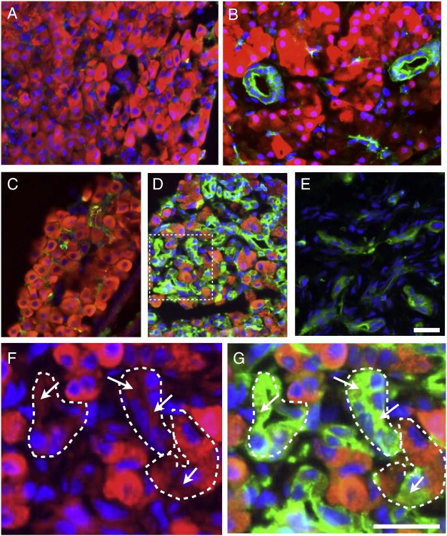 insulin positive cells (arrow, stained red). D) carbonic anhydrase II (green) that is specific for duct cells and E) amylase (red) that detects an enzyme specific for acinar cells. D and E