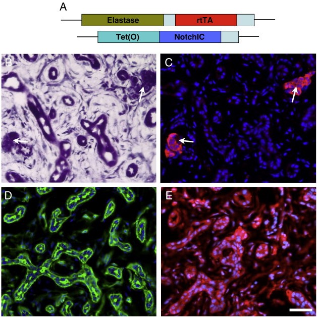 Notch and Kras reprogram pancreatic acinar cells to ductal intraepithelial neoplasia.
