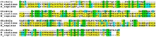 Figure 1. CheB42a encodes a protein with sequence similarity to aryl sulfotransferase 1A.Top line shows predicted aminoa acid sequence of Drosophila melanogaster CheB42a, and second and third lines show predicted amino acid sequences of Ornithorhynchus anatinus (platypus) and Homo sapiens (human) aryl sulfotransferase. Green, conserved residues; yellow, conserved residues in two of the aligned proteins; blue, similar residues. Accession numbers for the aligned proteins are: CheB42a, NM_206043.2; O_anatinus, NP_001121091; H_sapiens, NP_003157.1.
