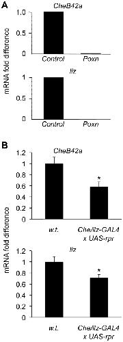 Figure 3. CheB42a and llz are expressed in the same chemosensory-related cells.A. The expression levels of both CheB42a and llz were reduced in homozygous Poxn mutants relative to heterozygote controls. Total RNA was extracted from male appendages and was analyzed by quantitative RT-PCR. Data are mRNA in Poxn relative to wild-type control. Expression levels were normalized to the housekeeping gene rp49. y-axis represents arbitrary mRNA fold-difference units, with control expression levels designated as 1 unit. B. Genetic ablationCheB42a/llz-expressing cells reduced expression of both transcripts. The CheB42a promoter-GAL4 line was crossed to UAS-rpr, which induces cell-death [29]. Analysis as in panel A.