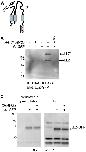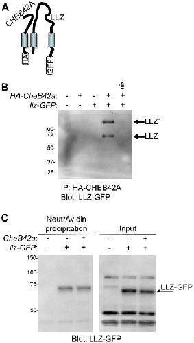 Figure 5. CHEB42A and LLZ can form a protein complex.A. Schematic of transfected proteins. B. Co-expression of tagged CHEB42A-HA and LLZ-GFP proteins. Immunoprecipitation with anti-HA antibody co-precipitated LLZ. “mix” indicates an experiment in which equal amounts of protein from the singly-transfected cells were mixed prior to immunoprecipitation as a control for non-specific interactions. Expression of llz produced two protein bands, the expected lower molecular mass band, plus a band of higher molecular mass. We do not know the identity of the more slowly migrating band; it might represent an LLZ-containing multiunit complex that is resistant to SDS denaturation or might represent post-translational modifications of LLZ [45]. We also attempted to detect HA-CHEB42A after immunoprecipitating LLZ-GFP, but were not successful. C. CHEB42A did not affect LLZ surface expression. COS7 cells were transfected with llz and either GFP or CheB42a. Surface expression level was estimated with biotinylation of surface proteins followed by neutravidin precipitation. To estimate total protein, protein input was directly blotted with anti-GFP antibody (right panel). We did not observe the larger LLZ' band in the surface expression study. We speculate that differences in sample processing protocols between the IP and surface expression studies could affect solubility and detection of larger protein complexes.