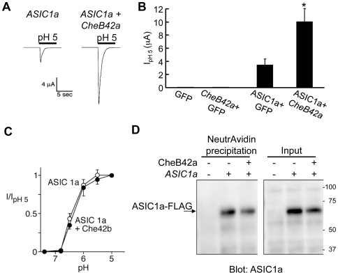 Figure 6. CHEB42A increases current from the mammalian DEG/ENaC protein ASIC1a.A–C. Effect of CHEB42A on H+-gated ASIC1a currents. Xenopus oocytes were injected with ASIC1a, GFP or CheB42a cDNAs alone or in combinations indicated. Bathing solution pH was reduced to 5 during time indicated. A. example of H+-gated currents from the ASIC1a channel. B. CHEB42A increases ASIC1a H+-gated currents. Asterisk indicates P<0.01 (two-tail t-test). Number of oocytes studied: 9 GFP, 9 CheB42a and GFP, 20 ASIC1a and GFP, and 27 ASIC1a and CheB42a. Data are mean ± SEM. C. CHEB42A did not affect the pH dependence of ASIC1a current. Closed symbols indicate ASIC1a and CHEB42A (n = 15) and open symbols indicate ASICla + GFP (n = 12). D. CHEB42A did not affect ASIC1a surface expression. Experiment was done as in Fig. 5B.