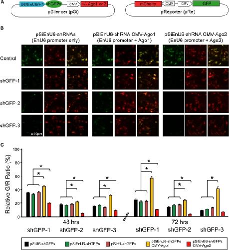 Figure 3. Effect of shRNA structure on RNAi efficacy. (A) Diagram of the pSi constructs containing shGFP or shGFPmir30 with or without Ago2 co-expression (left), and the pRe construct (right) for simultaneous GFP and mCherry expression. (B) G/R fluorescence intensity ratio measured from cells transfected with pSi constructs containing shGFP or shGFPmir30 with or without Ago2 co-expression. For shGFPs, Ago2 co-expression broadly enhances GFP knockdown (red bars). For shGFPsmir30, the RNAi efficiency increases for shGFP-1mir30 and shGFP-2mir30 but not shGFP-3mir30 (yellow bars). Additionally, Ago2 co-expression enhances knockdown with all shGFPsmir30to a level comparable to Ago2 co-expression with shGFPs. Asterisks represent statistical significance (p < 0.05, ANOVA-Scheffe's test).