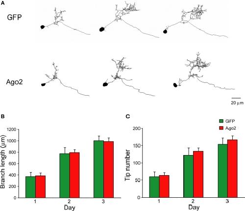 Figure 5. Neurons expressing ectopic Ago2 acquire normal dendritic arbor structure. Individual optic tectal neurons expressing GFP or GFP + Ago2 were imaged daily over 3 days in living animals (A). Total dendritic branch length (B) and branch tip number (C) were determined on 3D reconstructions of tectal neurons. Total branch length and branch tip number are comparable between GFP and Ago2-expressing neurons (p > 0.05, Mann–Whitney test).