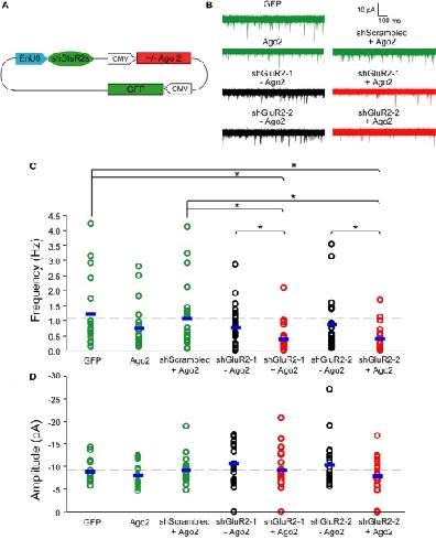 Figure 6. Ago2 expression enhances RNAi reduction of AMPA receptor-mediated synaptic responses in vivo. Whole-cell recordings were made from CNS neurons of Xenopus tadpoles transfected with pSi construct expressing shRNAs targeting the GluR2 subunit of AMPA receptor with or without Ago2 co-expression. (A) Diagram of the pSi constructs containing EnU6-shGluR2s for GluR2 knockdown, Ago2 for RNAi enhancement and GFP for cell identification. (B) Representative traces of spontaneous AMPA mEPSCs, superimposed from 30 consecutive traces. Cells co-expressing Ago2 with shGluR2-1 or shGluR2-2 (red) appear to have fewer mEPSCs than cells expressing shGluR2-1 or shGluR2-2 alone (black) and other control (green) traces. (C) Frequency of AMPA mEPSC in neurons transfected with pSi construct expressing shGluR2s with Ago2 (red) is significantly less than cells transfected with the pSi construct expressing shScrambled + Ago2 or GFP alone ((green) and neurons expressing shGluRs only (black) (p < 0.05, ANOVA). Neurons expressing shGluR2s without Ago2 co-expression (black) have mEPSC frequency comparable to controls transfected with shScrambled + Ago2 and GFP alone (green). Neurons expressing GFP alone, Ago2 alone and shScrambled + Ago2 have comparable AMPA mEPSC frequencies. Dashed gray line indicates the averaged frequency of shScrambled control. (D) Amplitudes of AMPA mEPSC are not different between neurons transfected with GFP alone, Ago2 alone, and shScrambled or shGluR2s with or without Ago2 co-expression. Dashed gray line indicates the averaged amplitude of shScrambled control.