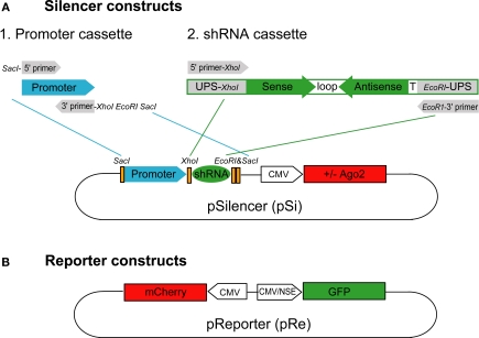 Figure 1. Silencer and reporter constructs used to test RNAi efficacy. (A) The silencer construct, pSi, includes two cassettes for easy exchange of promoters and shRNAs with or without Ago2 co-expression. The shRNA promoter fragments can be inserted into pSi through the SacI site on the vector and the shRNA fragments can then be inserted into pSi at XhoI and EcoRI sites. (B) The reporter construct, pRe, contains one CMV or NSE promoter for GFP expression and another CMV promoter for mCherry expression. The GFP silencing effect by shRNAs can be directly evaluated by calculating the green to red fluorescence intensity ratio in individual cells.