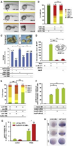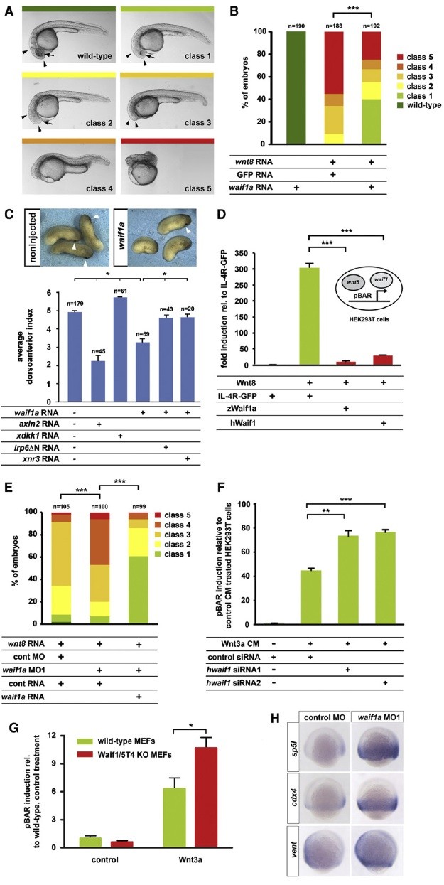 Figure 2. Waif1a Inhibits Wnt/b-Catenin Signaling (A) Classes of phenotypes induced by wnt8 overex- pression: class 1, small eyes (arrow); class 2, no eyes (arrow); class 3, reduced forebrain and midbrain (arrow- heads); class 4, loss of notochord indicative of enhance- ment of zygotic, organizer-restricting Wnt signaling; and class 5, hyperdorsalized, indicative of activation of maternal, organizer-inducing Wnt signaling.