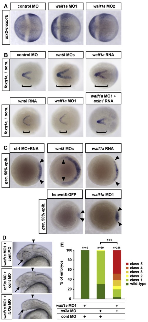 (B) Changes in size of the telencephalic foxg1a expression domain at the one somite stage (bracket) in embryos injected with 2 ng each of wnt8.1 and wnt8.2 MOs (20 of 21 embryos), 160 pg waif1a RNA (36 of 36), 0.4 pg wnt8 RNA (22 of 26), and 4 ng of waif1a MO1 (16 of 25) without or with 2 pg axin1 RNA (17 of 23). (C) Changes in the size of the dorsal gsc expression domain at the 50% epiboly stage (arrowheads) in embryos injected with 2 ng each of wnt8.1 and wnt8.2 MOs (41 of 42 embryos), 150 pg waif1a RNA (35 of 44), and 10 ng waif1a MO1 (20 of 21 embryos), relative to embryos injected with equimolar amounts of luciferase control RNA plus control MO and in hsp70l:Wnt8-GFP transgenic embryos heat shocked at 30% epiboly (46 of 46 embryos). (D) Head regions with eyes (arrows) and midbrain-hindbrain boundary (arrowheads) indicated at 24 hpf of embryos injected with 10 ng waif1a MO1 and 0.2 ng standard control MO, or 0.2 ng tcf3a MO plus 10 ng control MO. (E) Quantification of the tcf3a and waif1a knockdown synergy. Embryos were classified using the criteria introduced in Figure 2A, ***p < 0.001, chi-square test.