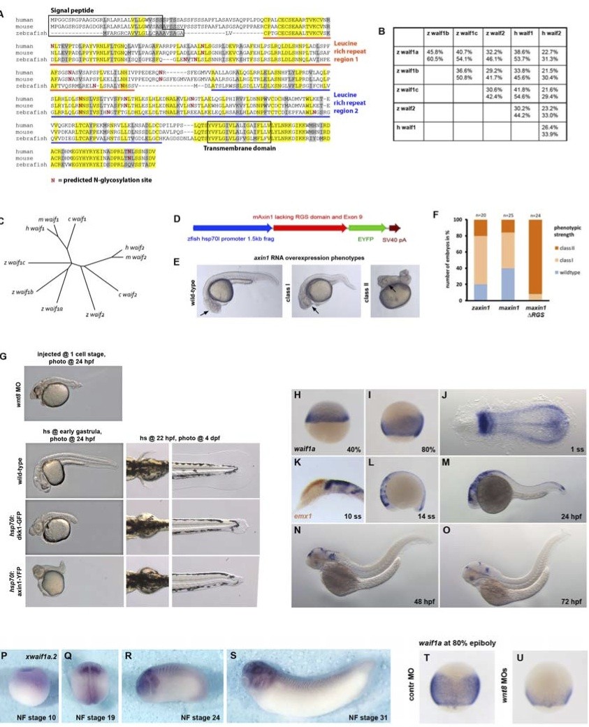 Figure S1, related to Figure 1. Waif phylogeny and expression during zebrafish and Xenopus embryogenesis and creation of a transgenic zebrafish line expressing Axin1-YFP after heat- shock. Data characterizing a newly created hs:axin1YFP transgenic fish line are presented, as well as, the primary sequence conservation of waif family members, the phylogenetic relationship of zebrafish and mammalian Waif proteins, the expression pattern of zebrafish waif1a and Xenopus waif1a.2 in wildtype embryos and data showing that waif1a expression is regulated by wnt8 in zebrafish embryos.