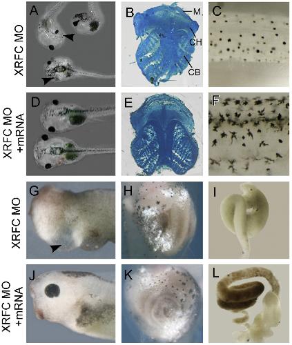 (A) Knockdown of XRFC caused craniofacial malformations (arrowheads) with curled trunks. (B) XRFC-MO inhibited the formation of cranial cartilage. Cartilages in late tadpoles were stained with alcian blue. Cartilage on the RFC-MO injected side was often malformed and reduced. M, meckel's cartilage; CH, ceratohyal cartilage; CB, ceratobranchial cartilage. (C) The XRFC-MO injected embryos were hypopigmented at tadpole stage. (G) The XRFC morphants showed enlarged pericardial cavity (arrowhead), indicative of heart defects. (H) The gut coiling in XRFC was malformed at tailbud (H) and tadpole (I) stages compared to the rescued group (K, L). (D, E, F, G, K, L) Co-injection of XRFC mRNA rescued the above mentioned malformations.