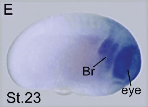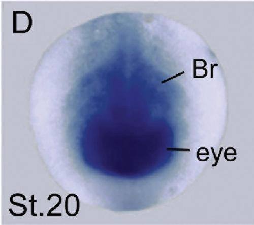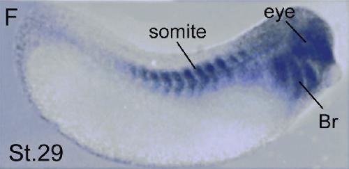 (A) XRFC is expressed maternally and throughout the stages examined (St.0 to St.32) as detected by RT-PCR. T, negative control without reverse transcriptase in the RT reaction. (B) Expression of XRFC at the indicated stages revealed by in situ hybridization. (B) The maternal XRFC expression is detected at the animal pole at 2-cell stage. (C) At stage 18, XFRC is expressed at the anterior neural plate and its border. (D) At the late neurula stages, the expression of XRFC is detected in the prospective eye and forming branchial arches. (F) At tailbud stage, XRFC is strongly expressed in the branchial arches, eyes, head mesenchyme and the somites. Br, branchial arch.