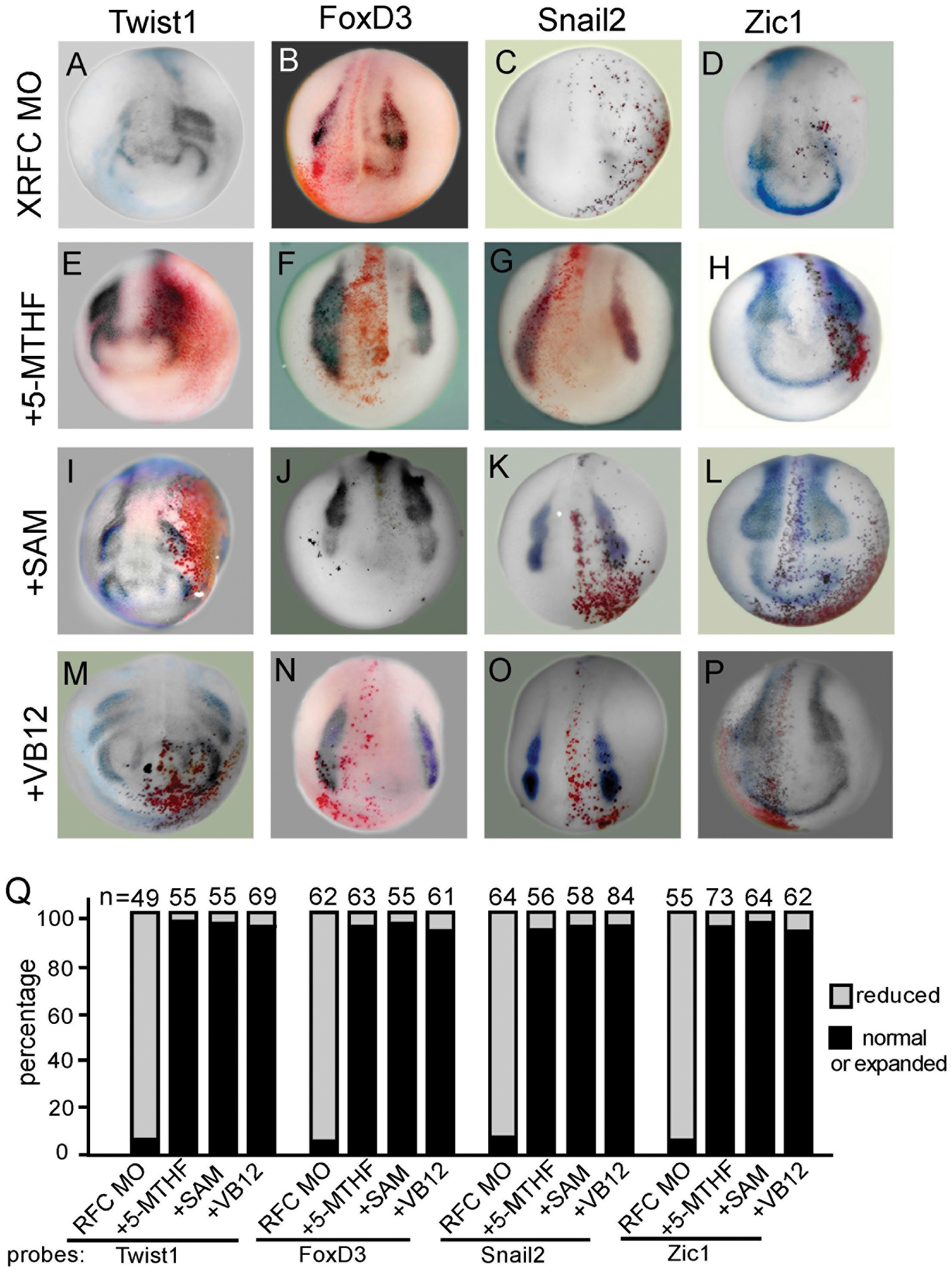 Co-injection of 5-MTHF (20 ng/embryo, E), SAM (10 ng/embryo, I) or Vitamin B12 (50 ng/embryo, M) with XRFC-MO rescued the expression of the neural crest maker genes (compare with A). (Q) Quantification of the rescue of the XRFC-MO effect by 5-MTHF, SAM, and Vitamin B12.
