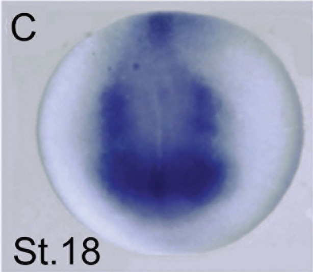 slc19a1 (solute carrier family 19 (folate transporter), member 1) gene expression in Xenopus laevis embryos, NF stage 18, as assayed by in situ hybridization, anterior view, dorsal up.