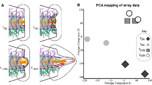 Figure 3. Array analysis of X. tropicalis tail regeneration. (A) The schematic diagrams of the early, intermediate, and late stages of tail regeneration. The circled areas depict the portion of tissue, and hence the RNA, collected and used for array analysis. (B) Shows the similarities of the eight arrays (four array time points in duplicate) using principal component analysis (PCA) mapping.