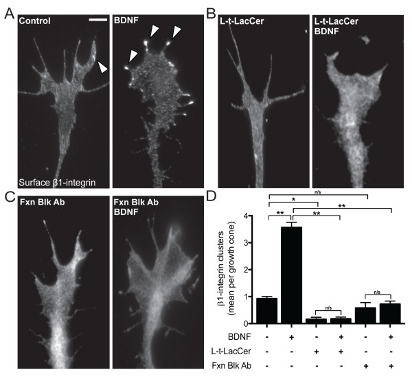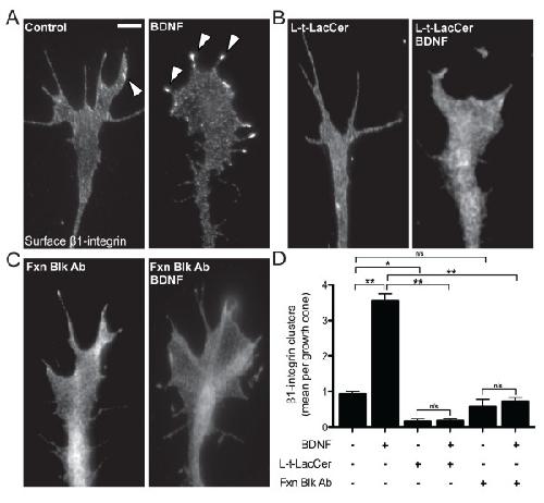 Figure 3. BDNF-induced β1-integrin clustering requires intact lipid microenvironments and functional β1-integrin. (A) Representative immunolabeled images showing β1-integrin after vehicle (BSA), BDNF (50 ng/mL; 20 min), (B) L-t-LacCer (20 μM) and L-t-LacCer plus BDNF, and (C) β1-integrin function blocking antibody (Fxn Blk Ab, 5 μg/mL) alone and plus BDNF treatments. Arrowheads designate clustered β1-integrins. Scale bar, 5 μm. (D) Quantification of β1-integrin clustering according to the treatment groups. Data are the mean ± standard error of the mean. (n > 150, **P < 0.001, ANOVA with Tukey's post hoc analysis.) BDNF: brain-derived neurotrophic factor; BSA: bovine serum albumin; L-t-LacCer: β-D-lactosyl-N-octanoyl-L-threo-sphingosine.