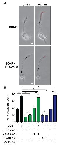 Figure 4. Disrupting β1-integrin clustering impedes BDNF-dependent axon outgrowth. (A) Axon growth assays with BDNF (50 ng/mL) or L-t-LacCer (20 μM) plus BDNF treatments demonstrating representative growth rates during a 60-min period. Scale bar, 10 μm. (B) Quantification of the axon growth rates of vehicle (BSA), BDNF, L-t-LacCer alone, L-t-LacCer plus BDNF, D-e-LacCer (20 μM), D-e-LacCer plus BDNF, β1-integrin function blocking antibody 2999 (Fxn Blk Ab; 5 μg/mL) alone and plus BDNF, control antibody (Control Ab, 5 μg/mL) and Control Ab plus BDNF treatments. Data are the mean ± standard error of the mean. (n > 150, **p < 0.001, ANOVA with Tukey's post hoc analysis). BDNF: brain-derived neurotrophic factor; BSA: bovine serum albumin; D-e-LacCer: D-lactosyl-β1-1'-N-octanoyl-D-erythro-sphingosine; L-t-LacCer: β-D-lactosyl-N-octanoyl-L-threo-sphingosine.