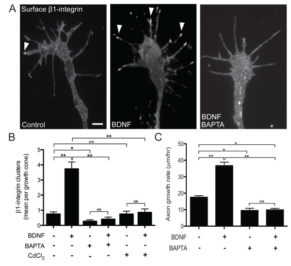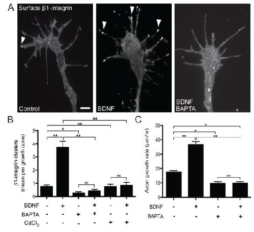 Figure 5. BDNF-induced β1-integrin clustering and stimulated axon outgrowth is Ca2+-dependent. (A) Representative immunolabeled growth cones showing the distribution of surface β1-integrin after treatments with vehicle (BSA), BDNF (50 ng/mL), or BAPTA-AM (1 μM; 30 nM [Ca2+]e) plus BDNF. Arrowheads denote β1-integrin clustering. Scale bar, 5 μm. (B) Quantification of β1-integrin clustering according to treatments with vehicle (BSA), BDNF (50 ng/mL), BAPTA-AM (1 μM; 30 nM [Ca2+]e) alone, BAPTA-AM (1 μM; 30 nM [Ca2+]e) plus BDNF, CdCl2 (50 μM; 20 min) alone, and CdCl2 plus BDNF. (C) Quantification of the mean axon growth rate after treatments with vehicle (BSA), BDNF (50 ng/mL), BAPTA-AM (1 μM; 30 nM [Ca2+]e), and BAPTA-AM (1 μM; 30 nM [Ca2+]e) plus BDNF. Data are the mean ± standard error of the mean. (n > 100, *P < 0.05, **P < 0.001, ANOVA with Tukey's post hoc analysis.) BDNF: brain-derived neurotrophic factor; BSA: bovine serum albumin; [Ca2+]e: extracellular Ca2+ concentration.