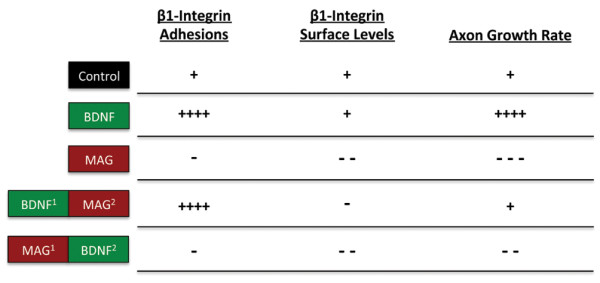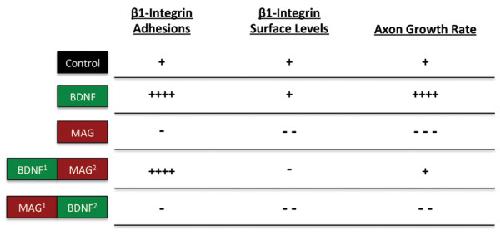 Figure 7. Comparison of bidirectional β1-integrin remodeling during nerve growth. Summary figure showing the clustering and global surface levels of β1-integrin in the growth cone correlated with the mean axon growth rate for the experimental treatments in Figure 6. Superscripts denote order of treatment. Symbols (+/-) denote positive and negative effects relative to controls.